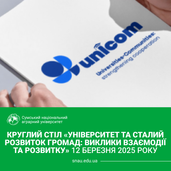 12 березня 2025 року в рамках реалізації проєкту UNICOM  в Сумському національному аграрному університеті відбувся круглий стіл «Університет та сталий розвиток громад: виклики взаємодії та розвитку», присвячений осмисленню нової ролі університетів у процесах місцевого та регіонального розвитку.